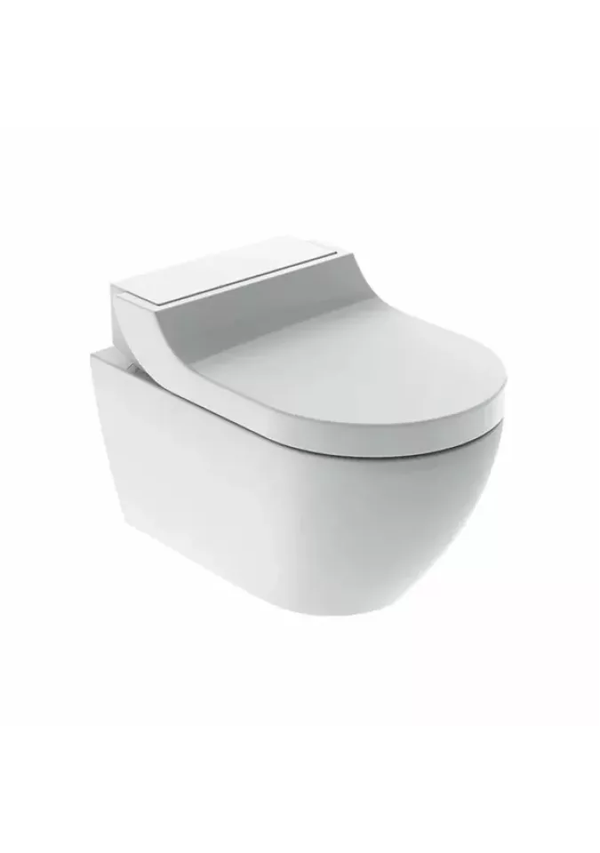 Setul este format din: Vas wc Rimfree suspendat, avand dimensiunea de 553x360x340 mm, fabricat din ceramica glazurata KeraTect, in finisaj alb. Vas wc Rimfree este cu spalare verticala, avand material de fixare inclus, cu set de racordare, set de izolare acustica, set de conectare pentru alimentare si protectie impotriva stropirii. Glazura KeraTect asigura o igiena de calitate superioara, extrem de neteda, foarte usor de intretinut, durabila si rezistenta la zgarieturi. Capac vas wc cu functie de bideu si ornament din sticla, avand dimensiunea de 523x360x106 mm, in finisaj alb, cu inchidere lenta soft-close, cu soft-opening, cu colac cu incalzire rapida, cu extractia mirosurilor si purificare aer cu filtru de particule ceramic, cu brat dus extensibil, cu pozitionare in 5 trepte, cu intensitatea jetului reglabila in 5 trepte, cu program de detartrare, cu spalare perineala, cu curatare preliminara si ulterioara automata a duzei de dus, cu detectie automata utilizator, cu uscare cu aer cald, cu 4 programe; cu reglare temperatura prin aplicatia Geberit AquaClean, cu clasa de protectie I, grad de protectie IPX4, agent detartrant inclus, cu telecomanda si baterie inclusa. Pentru intretinerea si indepartarea depunerilor de calcar se recomanda Geberit AquaClean Agent detartrant. Finisajul produsului este alb lucios. Garantie 60 luni. Produs fabricat de Geberit.