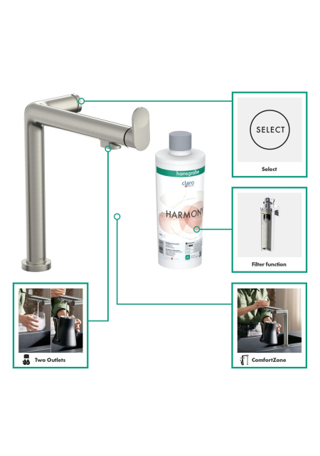 - compus din: mixer de bucătărie cu o singură manetă, cap de filtrare, cartuș mineralizator Harmony cu filtru