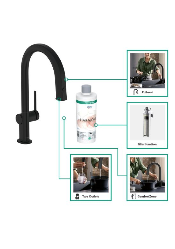 - compus din: mixer de bucătărie cu o singură manetă, cap de filtrare, cartuș mineralizator Harmony cu filtru
