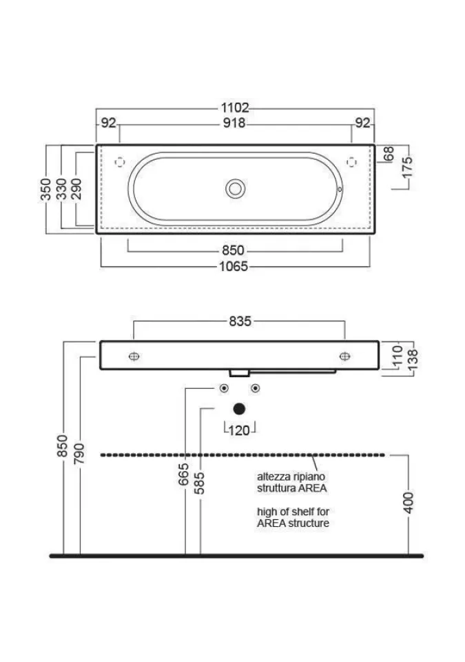 lavoar dreptunghiular, dimesiune de 110x35 cm, Area, cu 2 orificii pentru baterie si cu un orificiu de preaplin;