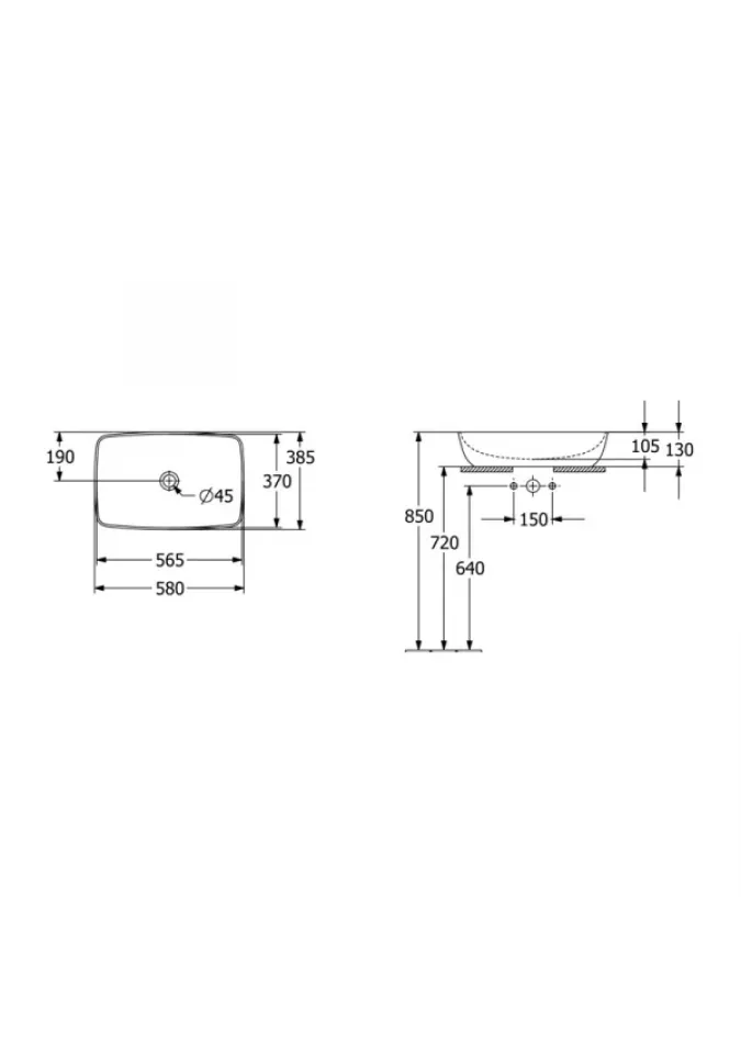 lavoar pe blat, dreptunghiular, fara orificiu pentru baterie, fara orificiu de preaplin