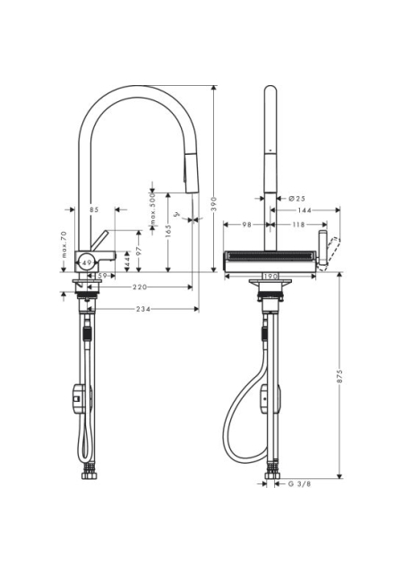 Baterie cu dus extractibil si trei tipuri de jet (spray laminar, spray normal si SatinFlow)