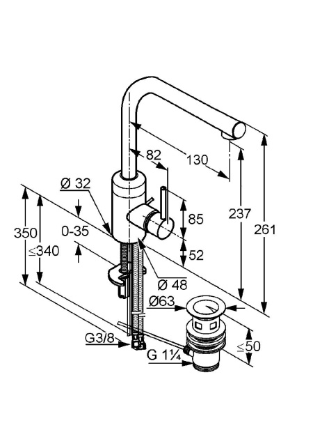 Baterie monocomandă pentru lavoar înalt DN 10 Mâner plin Montaj cu o trecere Clasă de debit Z Perlator PCA Cache M 16,5 x 1 Cartuş ceramic cu limitator de apă fierbinte Fără ventil de scurgere Racorduri flexibile G 3/8 Sistem de montare rapidă Clasă de zgomot I