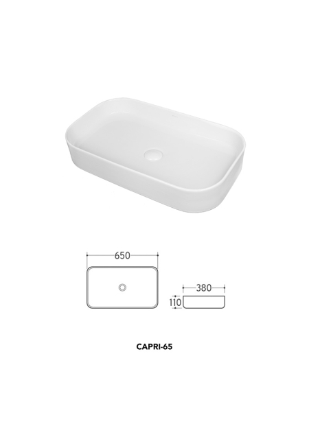 CAPRI-65, LAVOAR DREPTUNGHIULAR FARA PREAPLIN, FARA ORIFICIU PENTRU BATERIE, ALB LUCIOS 65X38,5X11CM, 8064-65