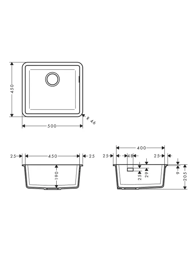 Chiuveta bucatarie cu o cuva, fabricata din SilicaTec, cu dimensiunea decupaj 448 x 398 mm, fara orificiu pentru baterie, cu pozitia preaplinului pe partea dreapta a cuvei, dimensiunea blatului de 60 mm, cu tip de instalare sub blat, cu adancime ciuvetei de 190 mm. Setul de fixare inclus. Setul de scurgere si bateria de bucatarie se comanda separat. Tehnologie Hansgrohe: SilicaTec: material inovator compus din 80% nisip de cuart, asigura suprafata neteda, termorezistenta (raze UV), rezistenta la zgarieturi si pete, datorita porozitatii reduse, este usor de curatat cu substante nepoluante si va arata tot timpul impecabil. Finisajul produsului este negru grafit (graphite black). Garantie 60 luni. Produs fabricat de Hansgrohe.