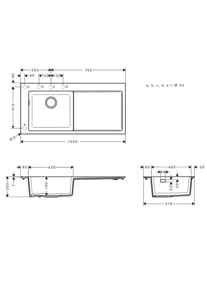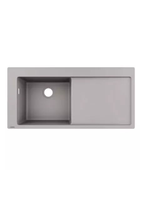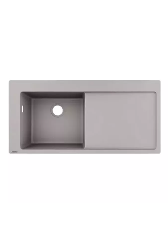 Chiuveta bucatarie fabricata din SilicaTec, cu dimensiunea decupaj 1030 x 490 mm, avand picuratorul in partea dreapta si cuva in partea stanga, cu drenaj, avand gaura pentru baterie predefinita (vezi schita tehnica), burghiu cu diamant inclus, pozitia preaplin pe partea stanga a cuvei, dimensiunea blatului de 60 mm, cu tip de instalare topmount, cu adancime ciuvetei de 190 mm. Set de fixare inclus: cleme pentru instalare usoara; burghiu diamant; matrita decupaj; instructiuni de montaj. Setul de scurgere si bateria de bucatarie se comanda separat. Tehnologie Hansgrohe: SilicaTec: material inovator compus din 80% nisip de cuart, asigura suprafata neteda, termorezistenta (raze UV), rezistenta la zgarieturi si pete, datorita porozitatii reduse, este usor de curatat cu substante nepoluante si va arata tot timpul impecabil. Finisajul produsului este gri deschis (concrete grey). Garantie 60 luni. Produs fabricat de Hansgrohe.