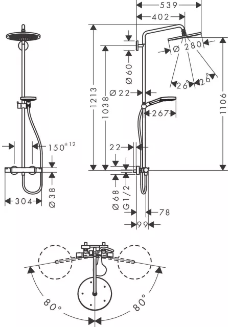 CROMA SELECT S, BRUSHED BRONZE, BATERIE TERMOSTATATA DUS, CU BARA DE DUS SU SUPORT DUS, CU CAP DE DUS 280, PARA DE DUS RAINDANCE SELECT S 3 JETURI, 26890140