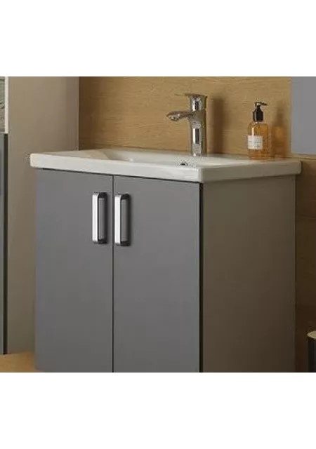 Setul promotional include mobilier si lavoar din gama Kolpasan, colectia Evelin, este realizat din MDF de culoare gri, se monteaza suspendat, prezinta 2 sertare cu manere cromate, materialul corpului este realizat din PAL special acoperit cu folie, de culoare gri lucios, si MDF, are urmatoarele dimensiuni : 765x440xH645 mm. Materialul lavoarului este ceramica sanitara, de culoare gri lucios. Avantajele MDF-ului sunt urmatoarele : rezistenta mult mai mare la umezeala, permite frezare pe suprafata placii astfel obtinand forme deosebite ale fronturilor; la mobilierul de baie, unde este foarte mare umezeala, este indicat sa folosim suprafete vopsite care sunt cele mai rezistente. Cum palul nu poate fi vopsit, folosirea MDF-ului este cea mai indicata.