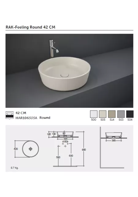 Lavoarul din gama Rak Ceramics face parte din colectia Feeling ce ofera eleganta prin liniile sale moderne. Acesta nu este prevazut cu preaplin.Fabricat din ceramica sanitara de culoare alb cu finisaj lucios. Inaltimea de 130 mm necesita o baterie pentru lavoar cu montaj pe blat. Istalarea se realizeaza pe blat iar setul de fixare este inclus.