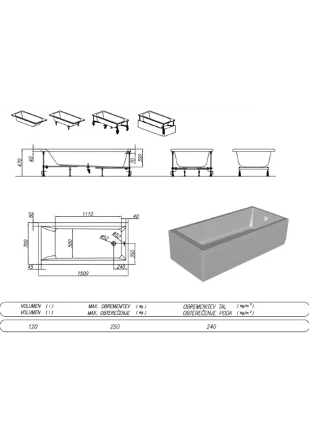 FIGARO 150, ALBA, CADA DREPTUNGHIULARA, INZIDIBILA, 150X70X47CM, ACRIL, 757630