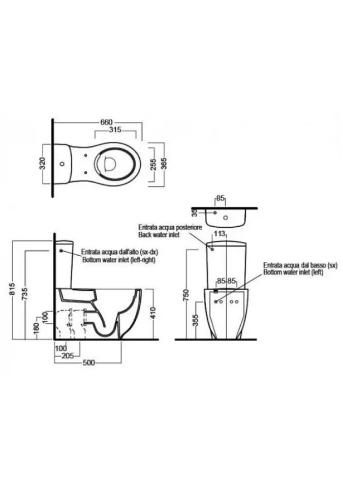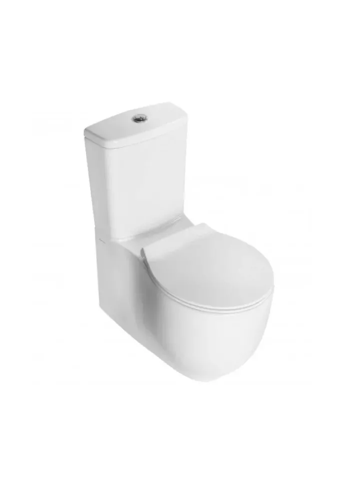 Vas WC stativ rectificat, rimless, cu evacuare universala; evacuarea este de fapt orizontala, dar corpul vasului WC este astfel realizat incat incape si un cot-racord, care transforma evacuarea orizontala in evacuare verticala