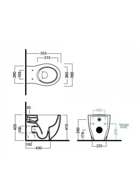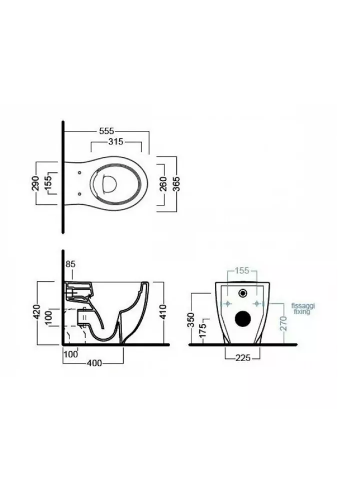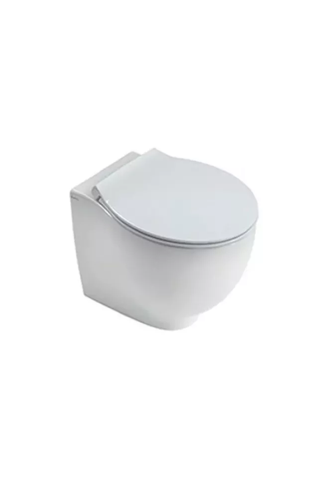 Vas WC stativ rectificat, rimless, cu evacuare universala; evacuarea este de fapt orizontala, dar corpul vasului WC este astfel realizat incat incape si un cot-racord, care transforma evacuarea orizontala in evacuare verticala