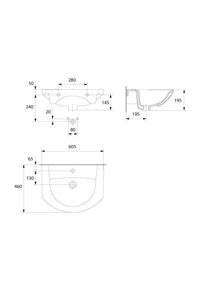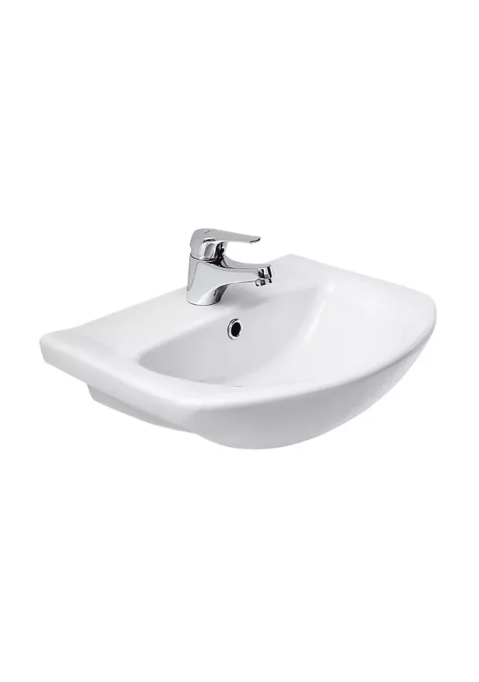 Orificiile pentru baterie, scurgere si preaplin sunt pozitionate in centru. Lavoarul este alb, construit cu o forma rotunjita, are greutatea de 14.1 kg si dimensiunile urmatoare: 60.5 cm lungime si 46 cm adancime.