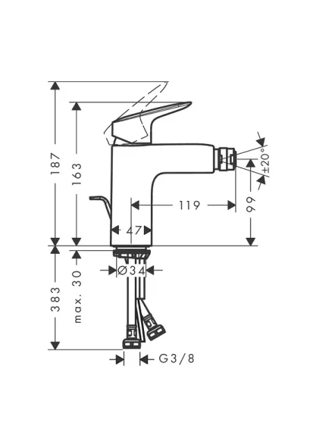 Bateria bideu monocomanda, cu proiectie 119 mm, avand aerator pivotant cu bila, cu cartus ceramic, cu limitare de temperatura reglabila, cu pulverizare normala, avand un debit la 3 bar de 7.2 l/min, cu ventil pop-up sintetic, cu racorduri flexibile G ⅜, pentru alimentarea cu apa calda-apa rece, adecvat pentru incalzitoarele de apa cu flux continuu. Dimensiune de conectare DN15. Setul contine si ventilul scurgere G 1¼, fiind potrivit pentru încălzitoare de apă cu flux continu. Tehnologii Hansgrohe: Air Power - mixeaza apa cu aerul oferind o senzatie de un jet delicat de apa; ComfortZone - Hansgrohe cu ComfortZone ofera o gama variata de inaltimi pentru baterii. Finisajul produsului este crom lucios. Garantie 60 de luni. Produs fabricat de Hansgrohe.