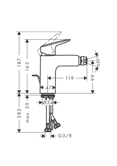 Bateria bideu monocomanda, cu proiectie 119 mm, avand aerator pivotant cu bila, cu cartus ceramic, cu limitare de temperatura reglabila, cu pulverizare normala, avand un debit la 3 bar de 7.2 l/min, cu ventil pop-up sintetic, cu racorduri flexibile G ⅜, pentru alimentarea cu apa calda-apa rece, adecvat pentru incalzitoarele de apa cu flux continuu. Dimensiune de conectare DN15. Setul contine si ventilul scurgere G 1¼, fiind potrivit pentru încălzitoare de apă cu flux continu. Tehnologii Hansgrohe: Air Power - mixeaza apa cu aerul oferind o senzatie de un jet delicat de apa; ComfortZone - Hansgrohe cu ComfortZone ofera o gama variata de inaltimi pentru baterii. Finisajul produsului este negru mat (matt black). Garantie 60 de luni. Produs fabricat de Hansgrohe.