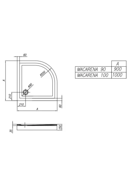 MACARENA 100/O, ALBA, CADITA DUS SEMIROTUNDA R55, CU MASCA, FI90, 100X100X15CM, MARMURA SINTETICA, 534630