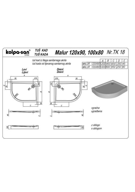 MALUR L 100X80/O, ALB, CADITA DUS SEMIROTUNDA, CU MASCA FRONTALA, DE STANGA, 100X80CM, ACRIL, 755550