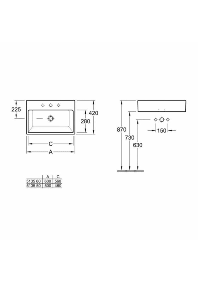 lavoar pe blat, dreptunghiular 60x42cm, cu orificiu pentru baterie, cu preaplin