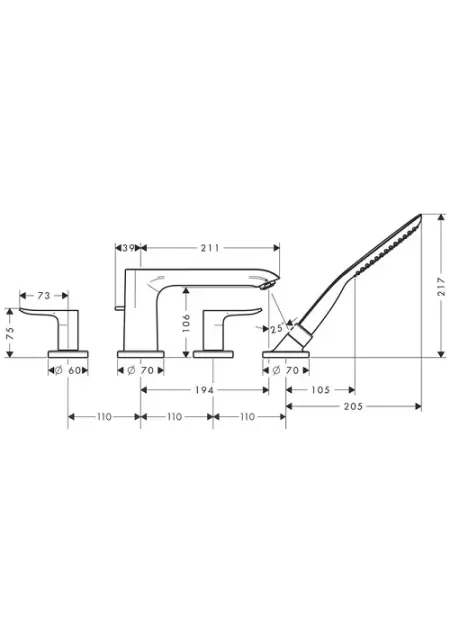 Set baterie pe cada cu 4 gauri, proiecție 220 mm, debit 22 l / min, supape ceramica cald/rece 90 °, valve unic-sens integrate. Dimensiunea conexiunii este de DN15. Garantie 60 de luni. Produs fabricat de HANSGROHE.
