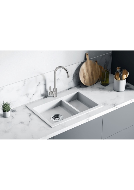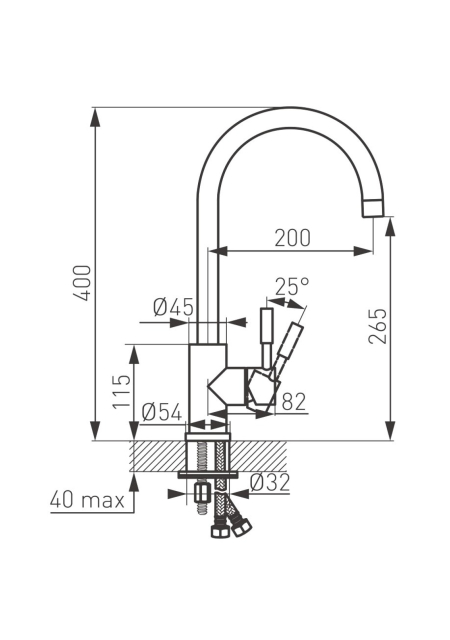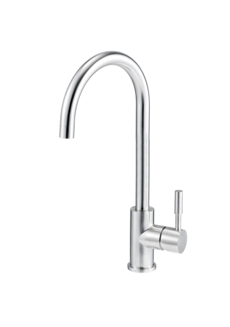 Baterie de bucătărie din alamă Ferro Paese BPE4 cu pipă pivotantă înaltă. Cartuș ceramic. Aerator M22x1. Racord flexibil G 3/8. Clasa de flux A.