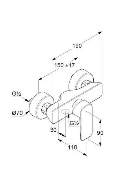 Baterie de dus monocomanda, avand dimensiunea de 190x110 mm, cu un debit de 21 l/min la presiune minima de 3 bar, cartus ceramic, limitator de temperature, maner plin, indicator pentru apa calda rosu si apa rece albastru, valva de protectie impotriva refluxului, racord iesire G 1/2". Finisaj crom. Garantie 60 luni. Produs fabricat de Kludi.