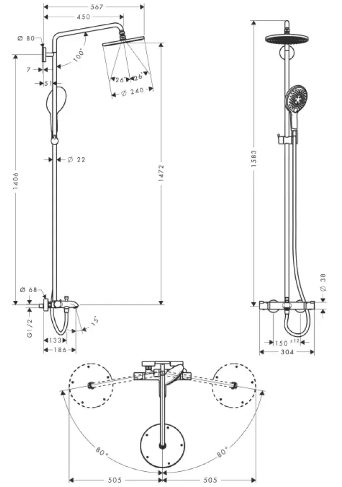 lungime braț de duș: 460 mm