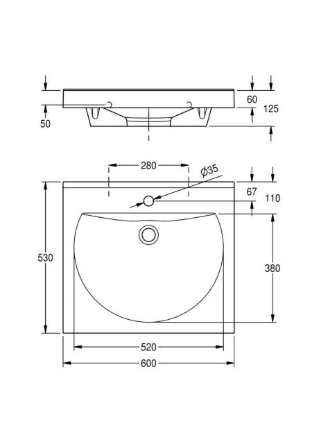 Dimensiunile bazinului (lățime × înălțime × adâncime): 520 × 90 × 380 mm.