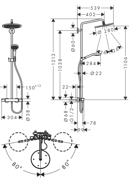 SISTEM DUS CROMA SELECT S 280 1 JET TERMOSTATIC, CU PARA DE DUS RAINDANCE SELECT S 120 E JET, POLISHED GOLD OPTIC