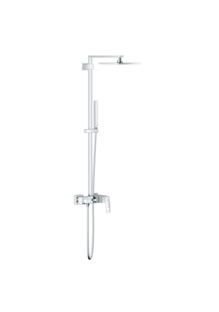 Sistemul de duș GROHE Rainshower 210 cu baterie termostatică pentru montare pe perete (cu ghidaj interior separat de apă) este format dintr-un braț de duș de 450 mm pivotant orizontal, termostatul expus Grotherm 3000 Cosmopolitan, cartușul compact GROHE TurboStat® cu termoelement de ceară, suprafața GROHE CoolTouch, finisajul cromat GROHE StarLight® și sistemul anticalcar SpeedClean. Deviatorul permite schimbarea între capul de duș modern Rainshower cu articulație sferică (unghi de rotație ±20°) și dușul de mână Sena cu GROHE DreamSpray® pentru un model perfect de pulverizare. Dușul de mână este reglabil în înălțime datorită elementului de alunecare. Setul include și un furtun de duș Silverflex de 1.750 mm.