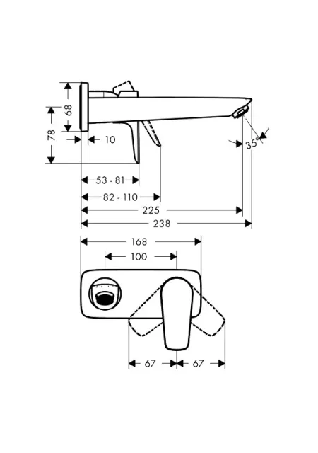 Baterie lavoar monocomanda alcatuita dintr-un mixer cu un singur levier pentru instalație ascunsa, cu montat pe perete, avand lungimea pipei de 238 mm, cu jet standard cu debitul de 5 l/min la 3 bari, cartus ceramic, cu limitator de temperatura reglabil, compatibila cu boilere cu flux continuu, ventil metalic standard. Tip de conexiune: set de baza, dimensiunea conexiunii: DN15, manerul poate fi pozitionat pe dreapta sau stanga, depinde de instalarea setului de baza. Tehnologii Hansgrohe: Air Power - consum redus de apa prin mixare cu aer; EcoSmart - consum redus de apa cu pana la 60%; QuickClean - aeratorul este dotat cu duza elastica de silicon, pentru o curatare rapida a impuritatilor.