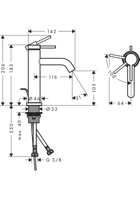 TECTURIS S, CROM, BATERIE DE LAVOAR COOLSTART ECOSMART+ CU VENTIL POP-UP, PIPA 10.5CM, 73314000