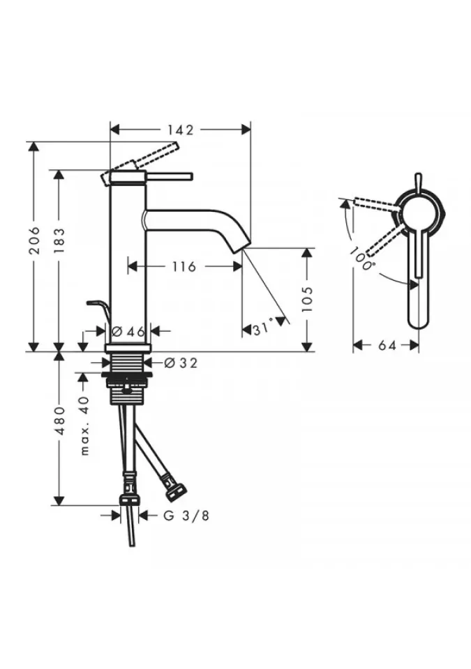 TECTURIS S, NEGRU MAT, BATERIE DE LAVOAR CU VENTIL POP-UP, PIPA 10.5CM, 73314670