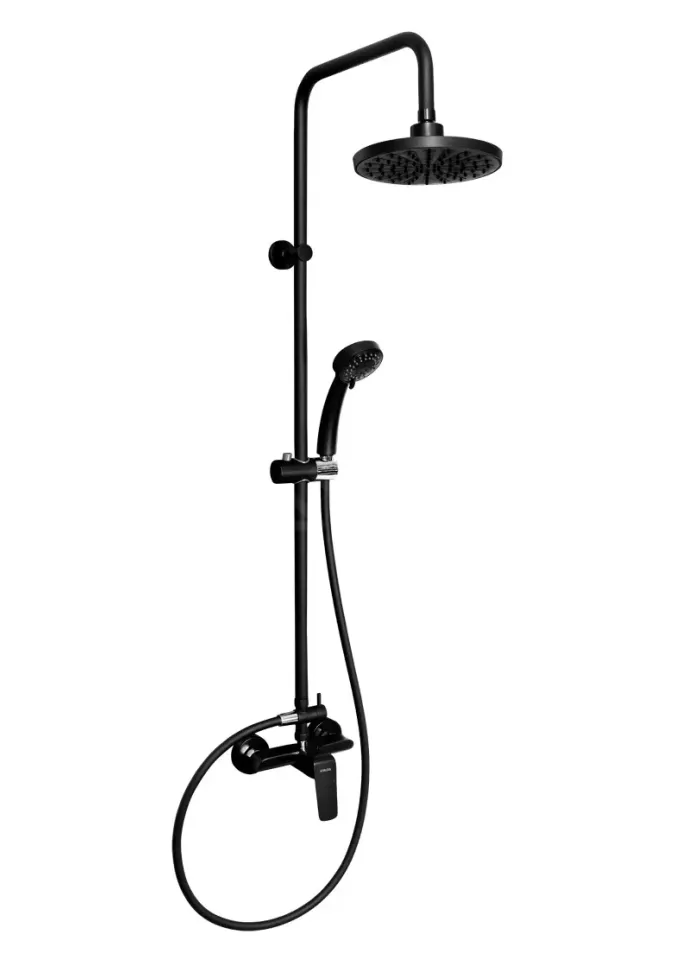 setul include baterie de perete, bară de duș cu suport glisant, pară de duș și pălărie de duș