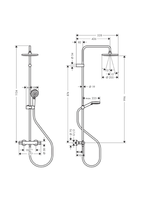 compus din: palarie de dus (cod: 26271000), para de dus (cod: 26270000), baterie termostatata de dus, furtun, slider