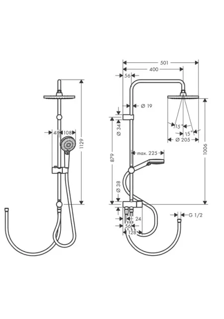 Set de dus este format din: Para de dus fixa Vernis Blend 200 1jet Rain 26271000, avand dimensiunea de 205 mm, cu articulatie sferica, avand unghiul de dus reglabil; Para de dus mobila Vario 2 Jet Rain, IntenseRain 26270000; bara de dus avand diametrul de 19 mm, avand glisor reglabil pe inaltime cu buton de blocare, lungimea bratului de dus este de 400 mm, Furtunul de dus cu lungimea de 160 cm 28266000; Racordarea la apa se face furtunul de dus Metaflex 80 28278000; debit maxim la 3 bari de 14,6 l / min, presiunea de lucru este min. 1 bar si max. 10 bari, dimensiunea conexiunii este de DN15 si filet de conectare G ½. Finisajul produsului este negru mat (matt black).