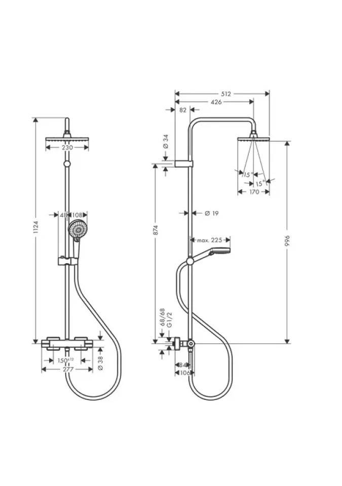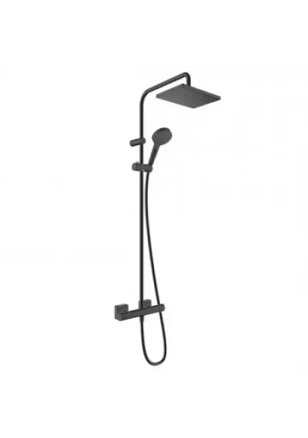 Sistemul de dus este format din: Bateria de dus cu termostatata Vernis, cu blocare de sigurantă la 40 ° C, si limitarea apei calde reglabile, avand prizele controlate prin manerul de rotire, cu instalare expusa, cu distanta centrala 150 ± 12 mm, avand dimensiunea conexiunii DN15 si filet de conectare G ½; Para de dus fixa Vernis Shape 230 1jet Rain, avand dimensiunea de 230 x 170 mm, cu articulatie sferica si unghi de dus reglabil; Para de dus mobila Vario 2 Jet Rain, IntenseRain, cu un debit maxim la 3 bari de 15,9 l / min, cu presiunea de lucru min. 1 bar si max. 10 bari, Brat de dus avand diametru bara de dus de 19 mm, cu glisor reglabil pe inaltime si buton de blocare, cu lungimea bratului de dus deasupra capului de 426 mm; Furtun de dus 1600 mm Metaflex. Finisajul produsului este negru mat (matt black). Garantie 60 luni. Produs fabricat de Hansgrohe.