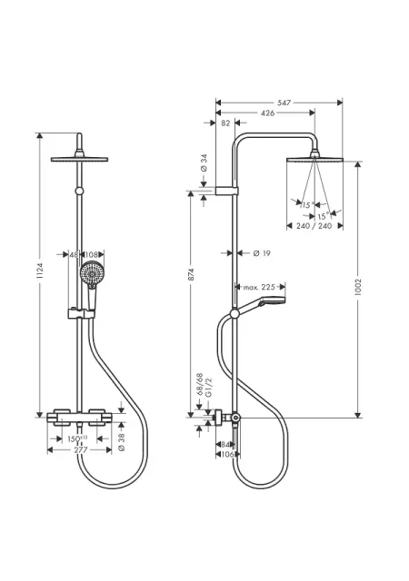 Sistemul de dus este format din: Bateria de dus cu termostat Vernis, cu blocare de sigurantă la 40 ° C, si limitarea apei calde reglabile, avand prizele controlate prin manerul de rotire, cu instalare expusa, cu distanta centrala 150 ± 12 mm, avand dimensiunea conexiunii DN15 si filet de conectare G ½; Para de dus fixa Crometta S 240, 1jet Rain, avand dimensiunea de 240x240 mm, cu articulatie sferica si unghi de dus reglabil; Para de dus mobila Vario, cu 2 tipuri de Jet, Rain, IntenseRain, cu un debit maxim la 3 bari de 15,8 l / min, cu presiunea de lucru min. 1 bar si max. 10 bari; Brat de dus avand diametru bara de dus de 19 mm, cu glisor reglabil pe inaltime si buton de blocare, cu lungimea bratului de dus deasupra capului de 426 mm; Furtun de dus 1600 mm Metaflex. Tehnologii Hansgrohe: QuickClean - aeratorul este dotat cu duza elastica de silicon, pentru o curatare simpla si eficienta; XXL Performance - distribuire uniforma a apei pe intreaga suprafata a corpului. Finisajul produsului este negru mat (matt black). Garantie 60 de luni pentru baterie si 24 luni pentru accesorii. Produs fabricat de Hansgrohe.