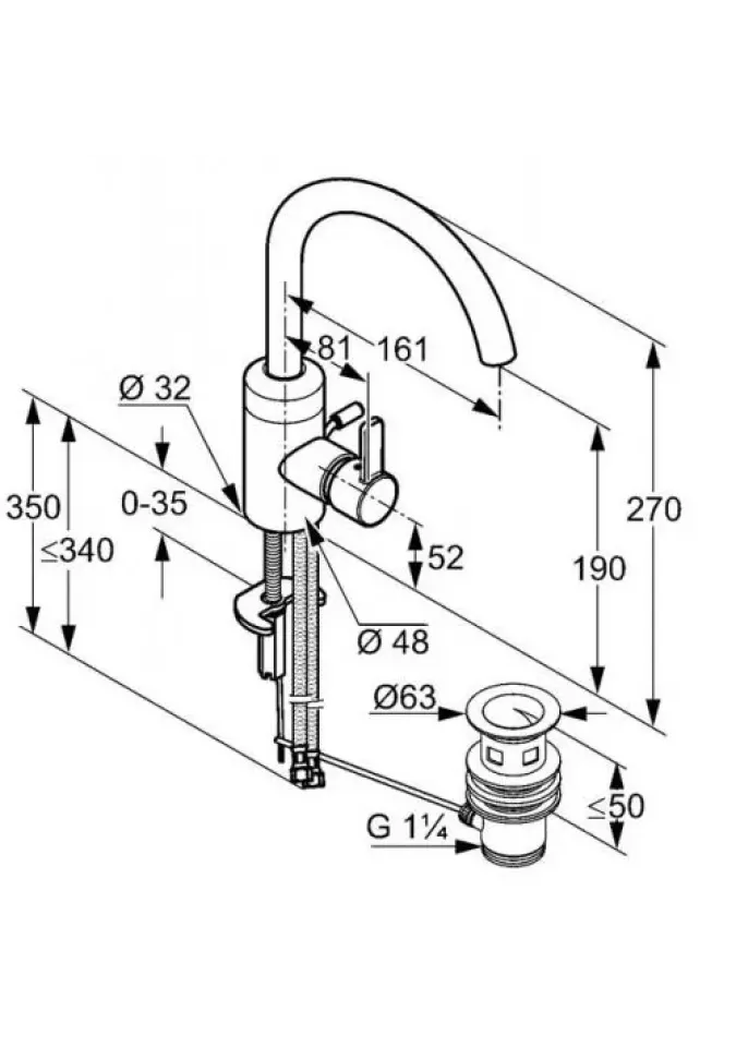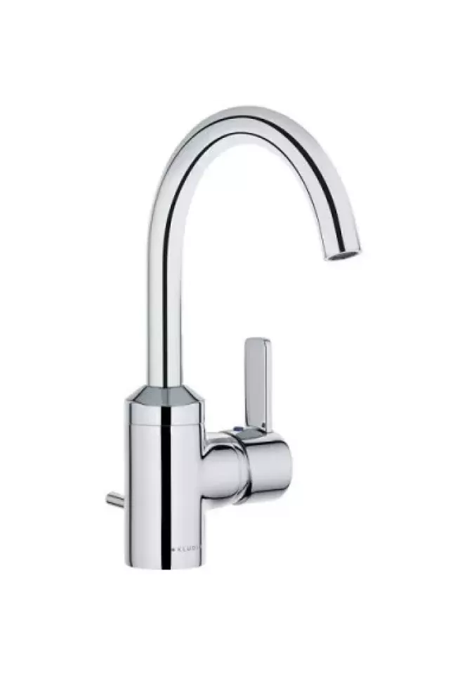 Baterie monocomandă lavoar inalta DN 10 (diametru nominal al racordului pe interior 10 mm), finisaj cromat. Corpul baterie este din alamă sanitară cu montaj cu o trecere, clasa de debit Z, diametrul perlatorului PCA Caché 16,5 mm (M 16,5 x 1), pipă mobilă (360°), cartuş ceramic cu limitator de apă fierbinte si sistem de montare rapida. Ventil de scurgere cu tijă G 1 1/4 (ţoli) si racorduri flexibile G 3/8 (ţoli) incluse in set. Produs calitate Germana. Garantie 60 luni. Produs fabricat KLUDI.