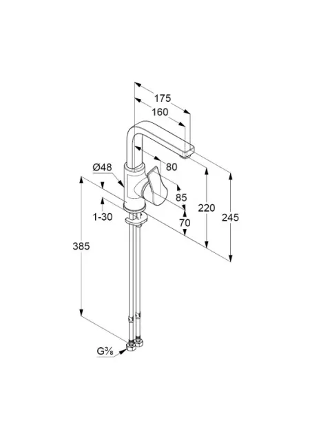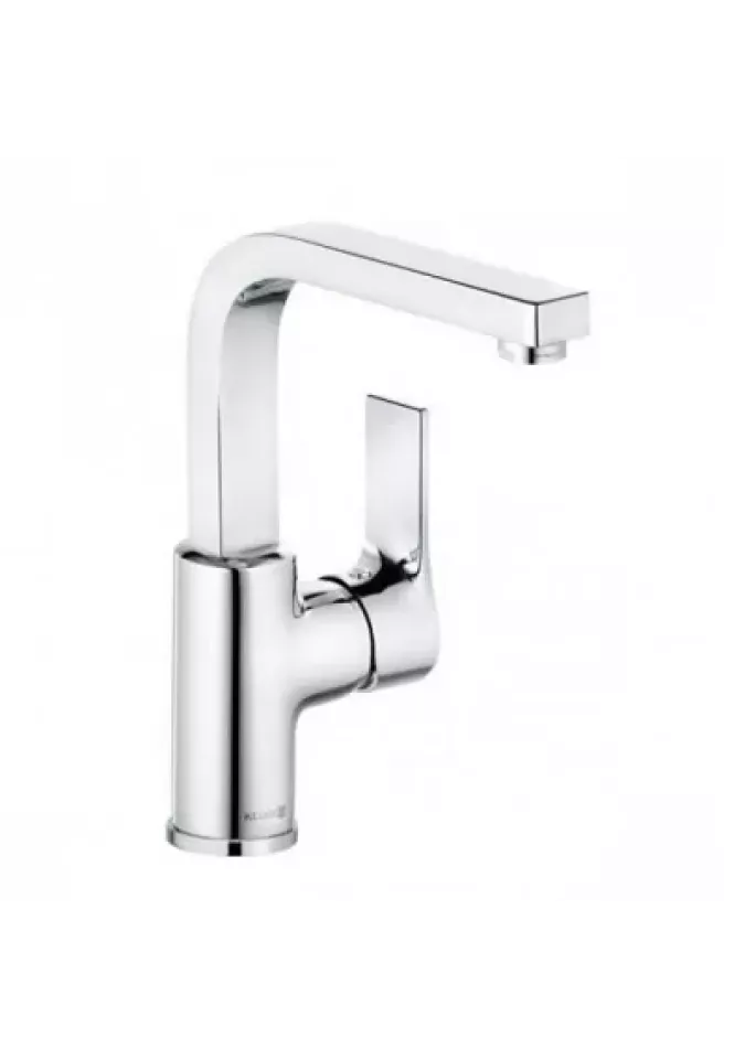 Baterie lavoar monocomanda, montaj cu o trecere pe lavoar, cu maner plin, cu pipa mobila cu rotire 360°, cu cartus ceramic cu limitator de temperatura, fara ventil, cu debit la 3 bar de 7 l/min, protectie impotriva fluctuatiilor de presiune a apei M 24 x 1, , cu racorduri de alimentare flexibile G 3/8, cu sistem de montaj rapid. Finisajul produsului este crom lucios. Garantie 60 luni. Produs fabricat de Kludi.